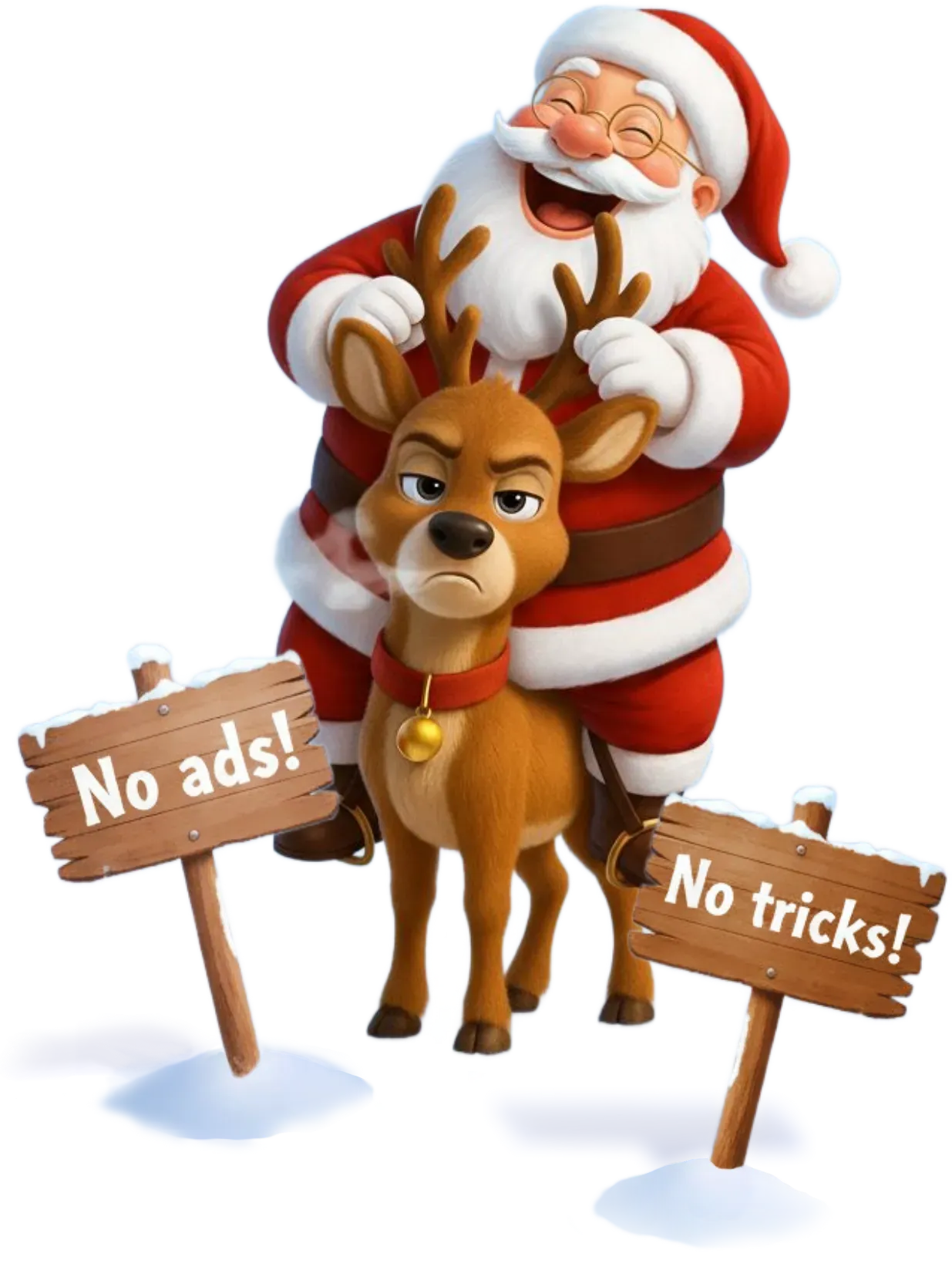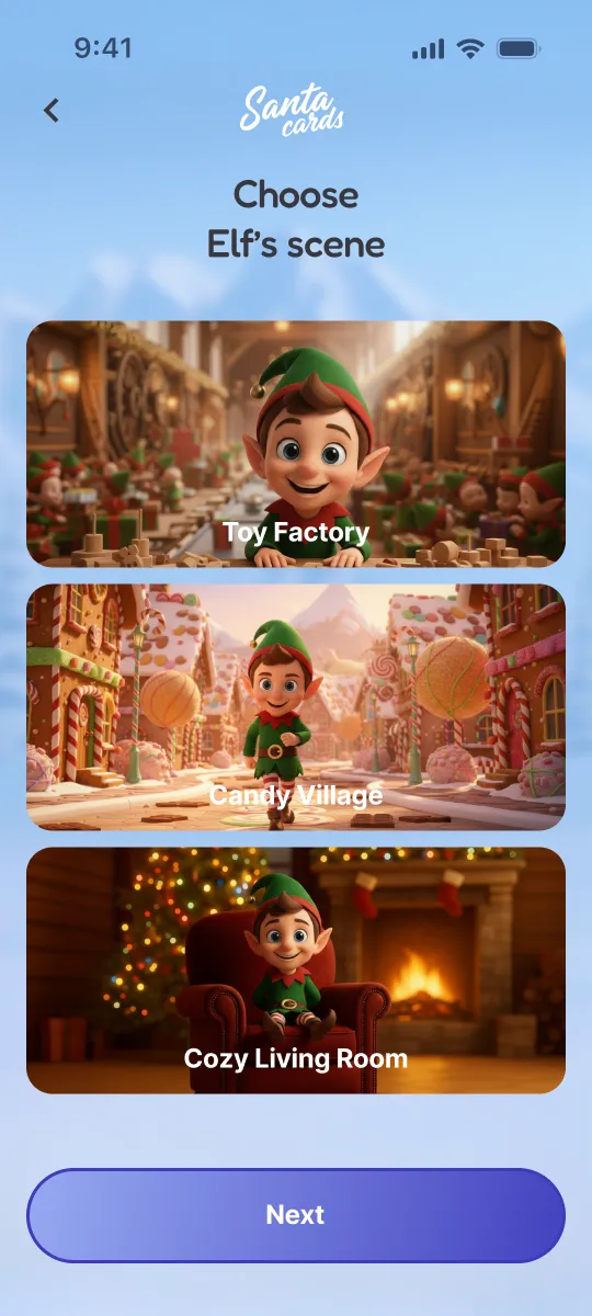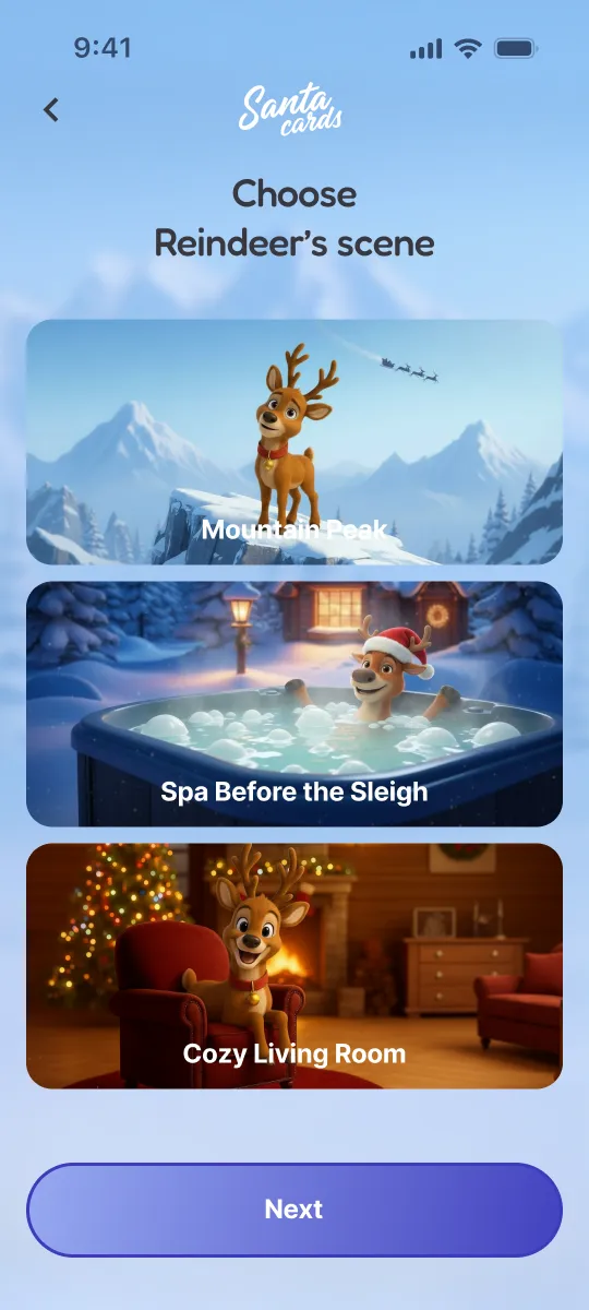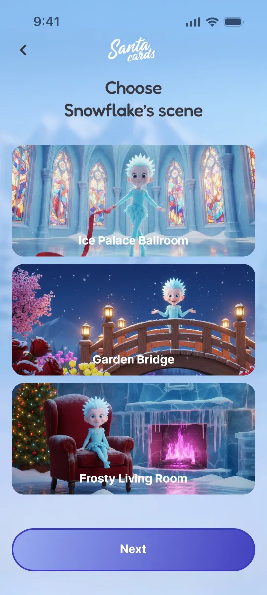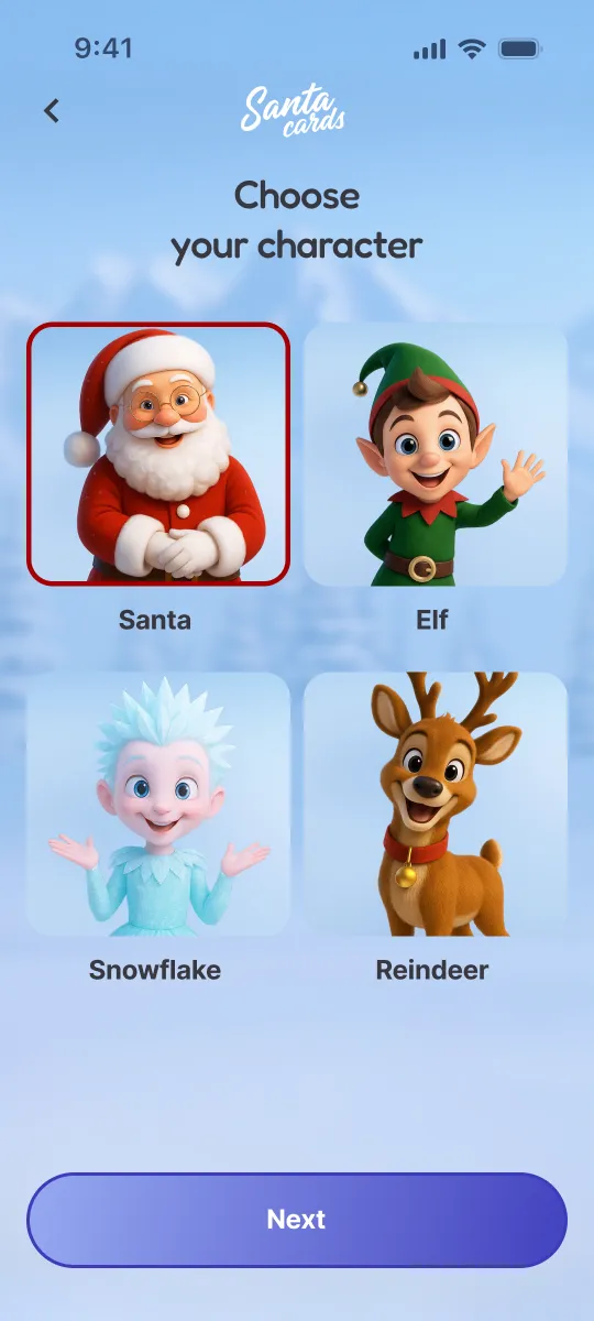 Choose your main character: Santa, Snowflake, Elf, or Reindeer and then pick a scene, each with its own unique set of animations and settings.